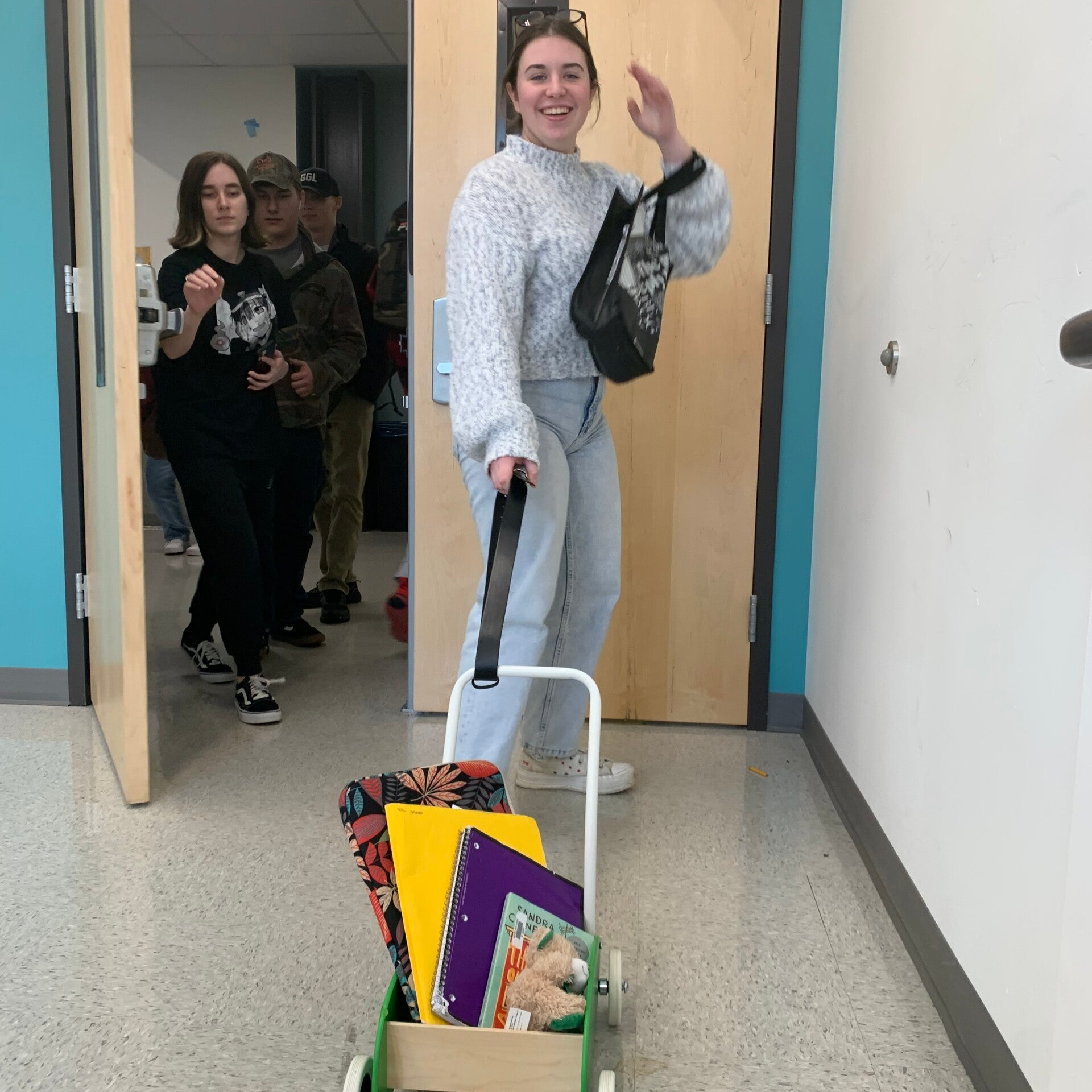 Il y a eu un jour qui était "Anything but a backpack" où nous devions venir en cours sans sac à dos, j'ai alors prit une charrette pour enfants que je tirait avec ma ceinture.